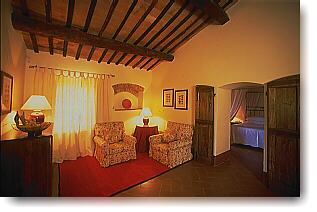 gni camera è differente dalle altre per arredi e decori. Le due suites al piano terra, ad esempio, dispongono di giardino privato e vasca idromassaggio; due al primo piano sono dotate di camino ed una terza di grandissime vetrate dalle quali si gode un panorama a 180 gradi sulla campagna e sui borghi circostanti; la suite più grande (oltre 70 metri quadri) è composta da una camera da letto matrimoniale, una singola, un salotto e due bagni; la camera singola, infine, con un ampio letto a baldacchino, può essere collegata con la suite adiacente per formare un vasto e confortevole appartamento.